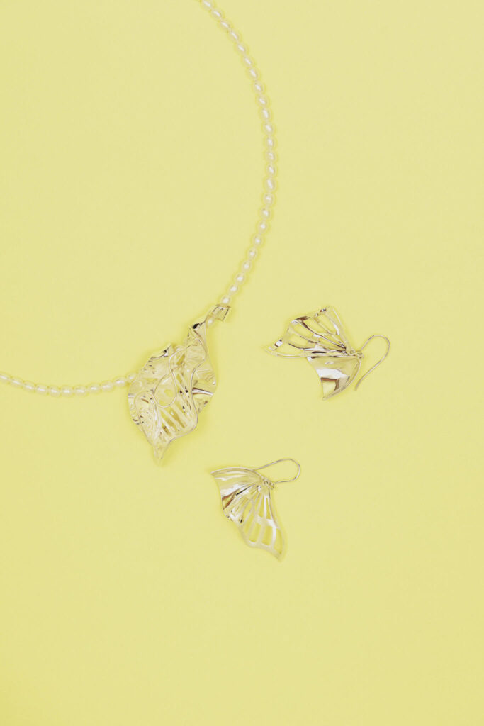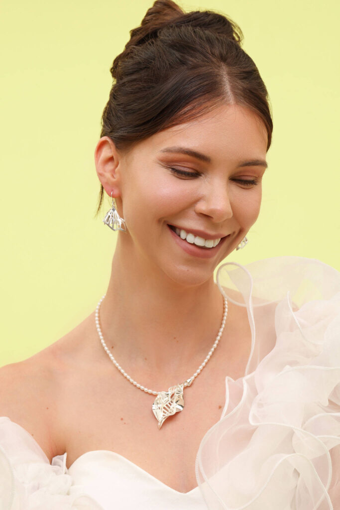 Yhteistyönä luotu kokonaisuus yhdistää muotoilun herkkyyden ja teknisen taidokkuuden koruksi, jossa hopea liikkuu kuin hameenhelma elokuisessa iltatuulessa. Hopeaa ja helminauhaa yhdistelevän korusarjan tunnelma keinuu kesäisissä muistoissa sekä iloisten hetkien kaipuussa ja kaihossa.