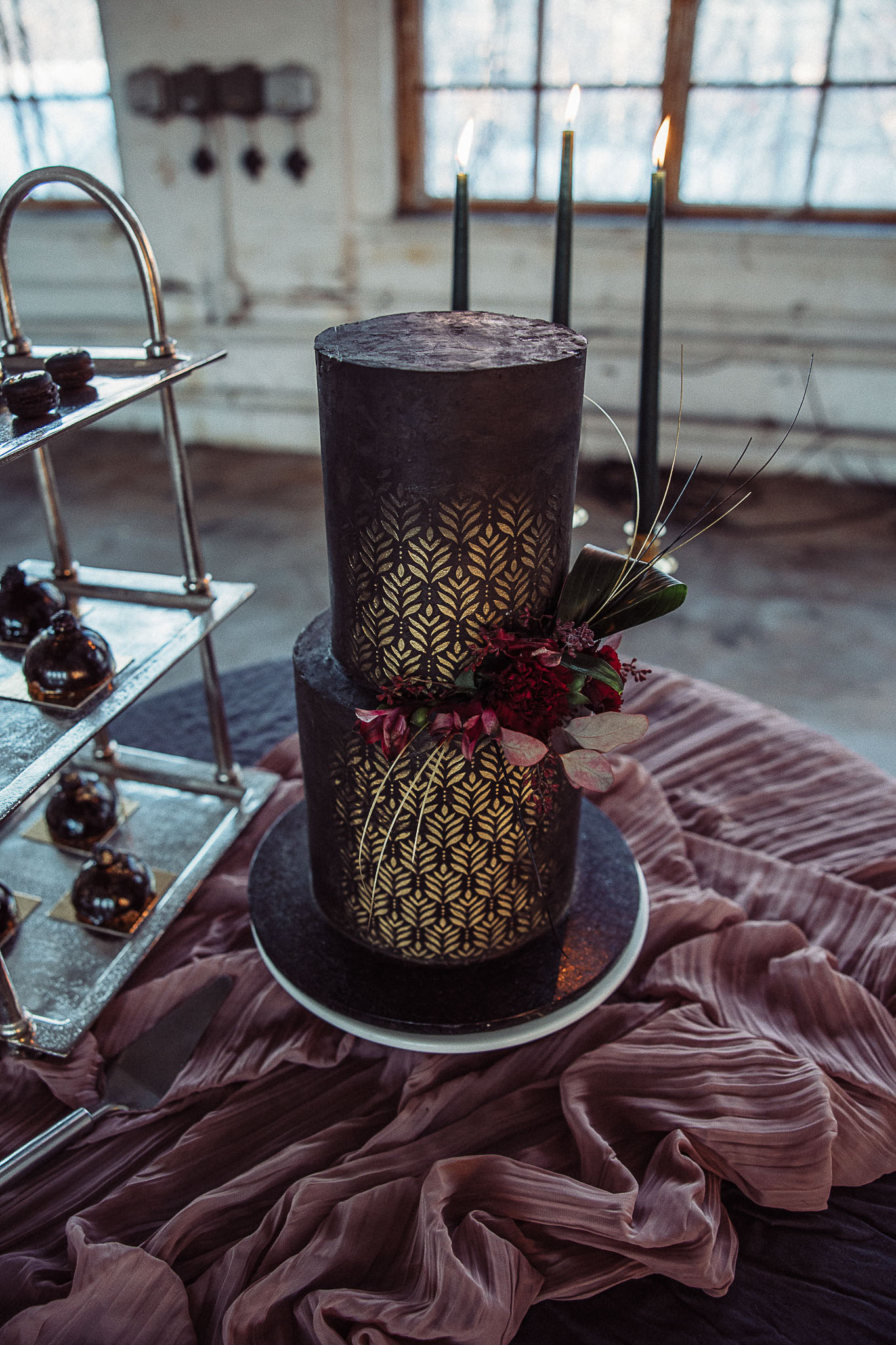 Tummat sävyt voivat toistua myös tarjoiluissa kuten hääkakussa ja leivonnaisissa. Kuvauksien tarjoilut Royal Bakery.