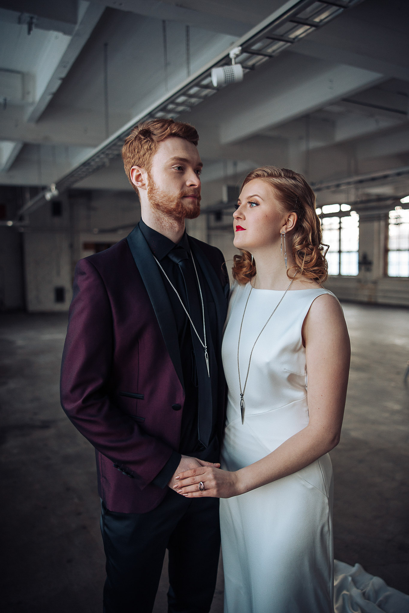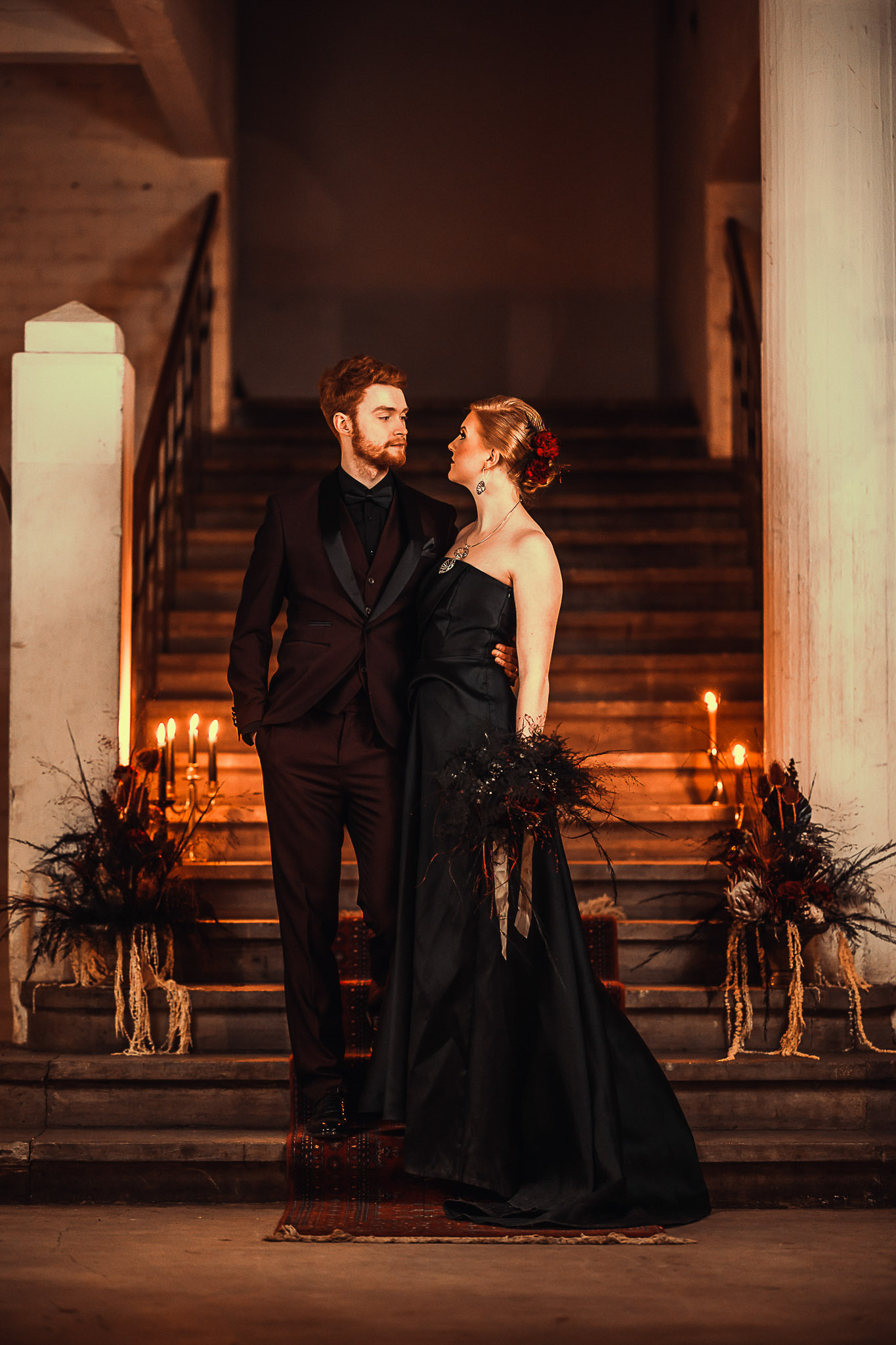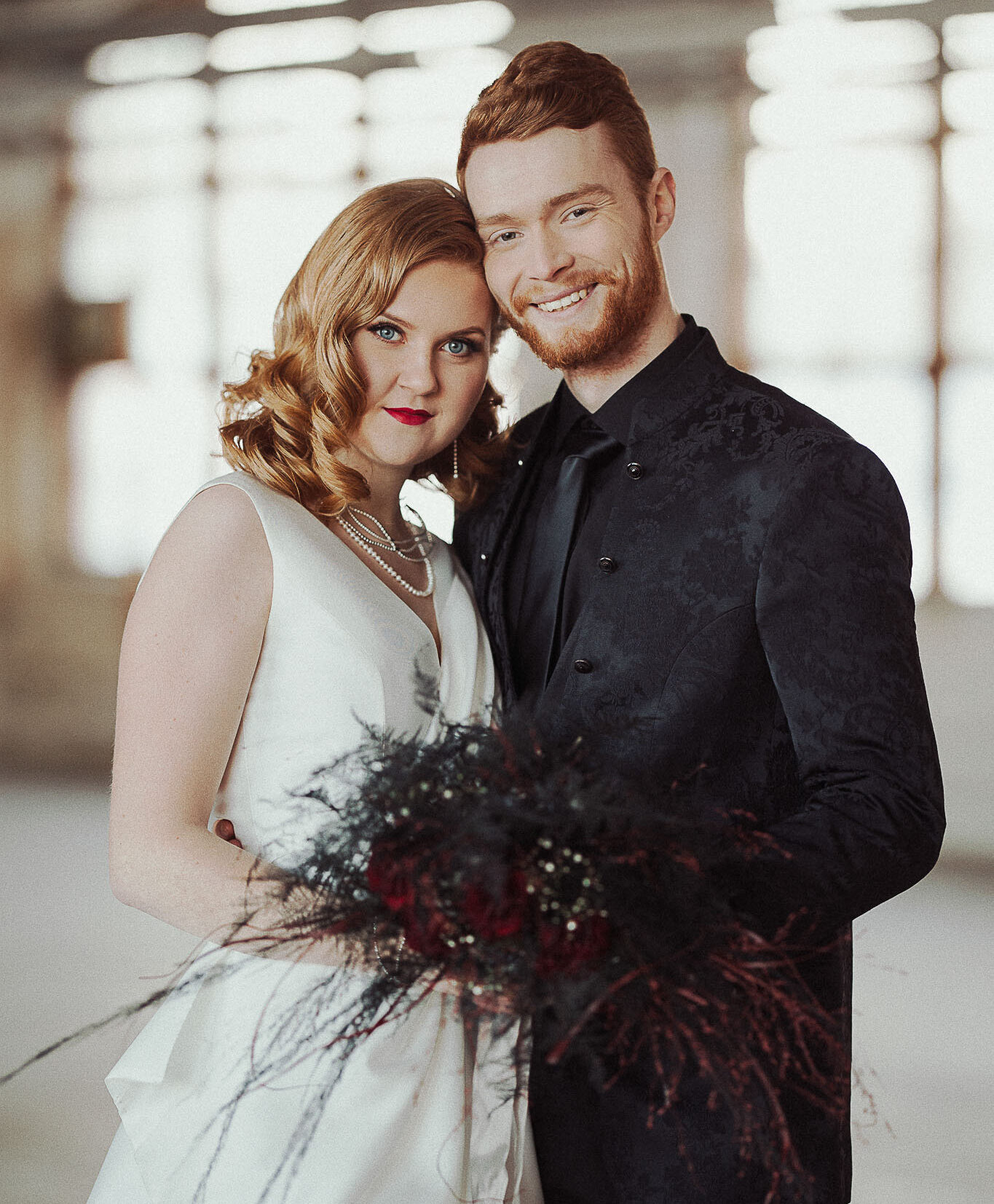 Tummaa tunnelmaa löytyy Hanna Korhosen 4C-korusarjasta koristepatinointina. Korusarja palkittiin Vuoden koru 2021 -kilpailun 3. sijalla. Morsiamen tumma iltapuku on Katri Niskasen ja sulhasen puku Kavaljeerista.