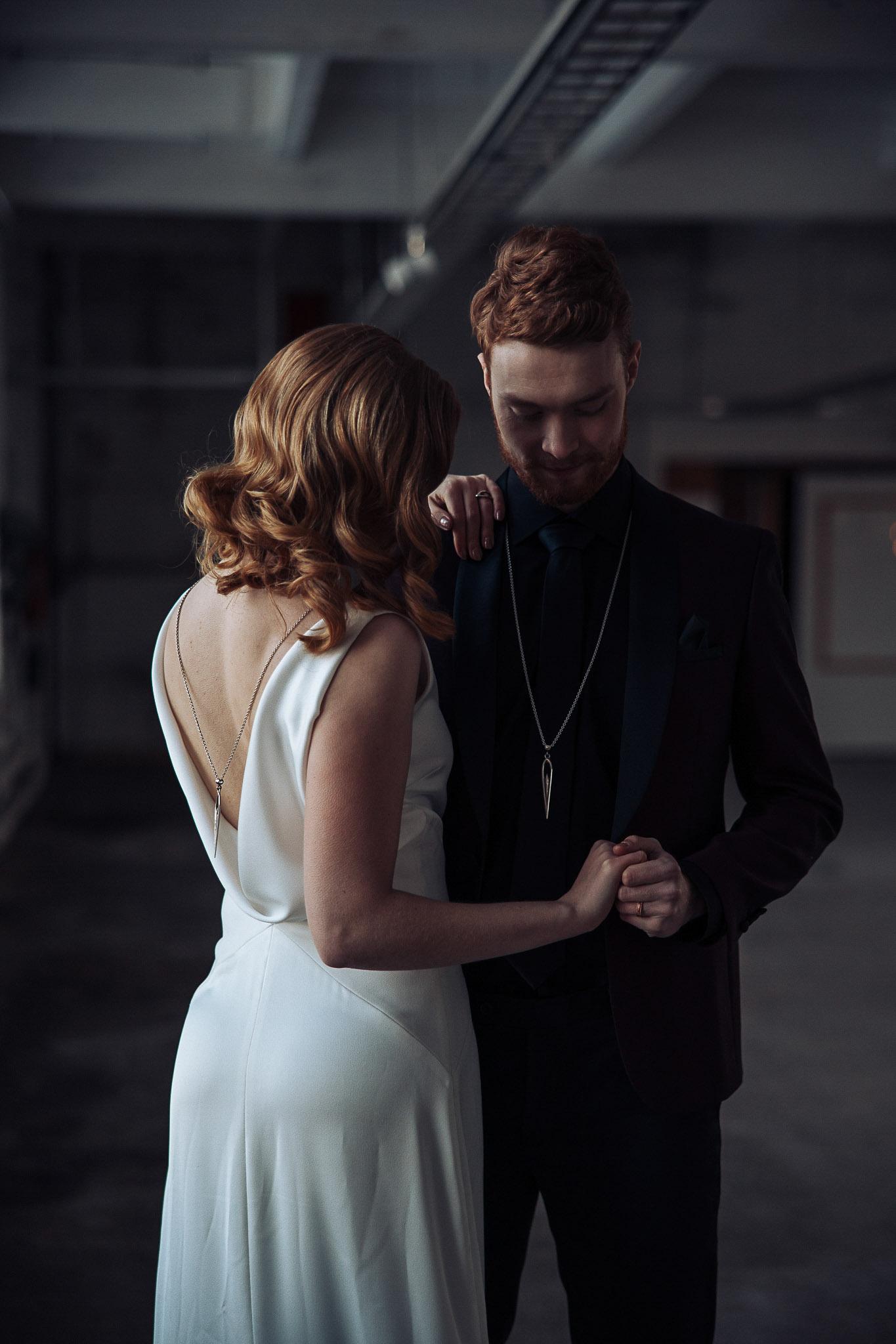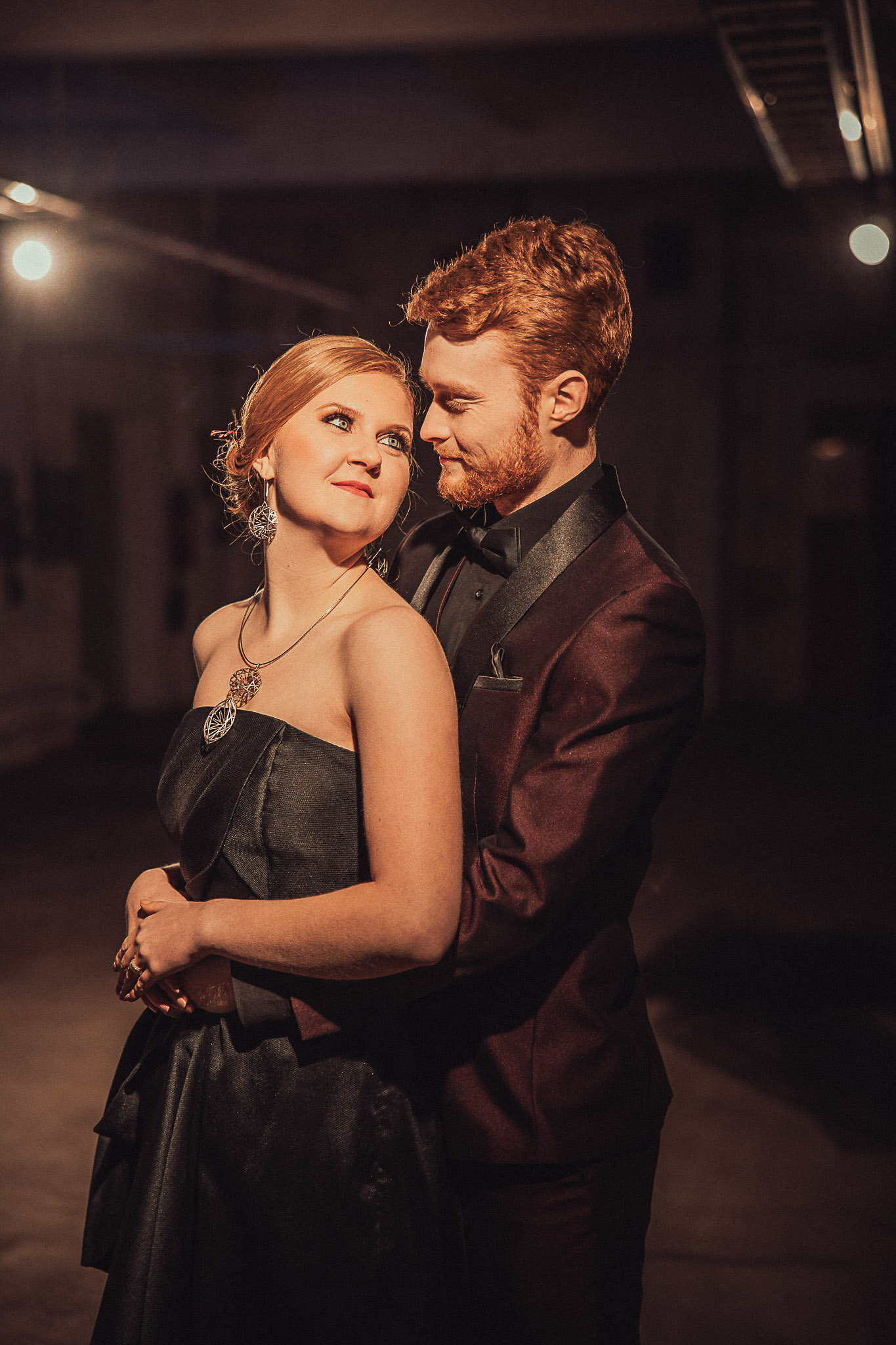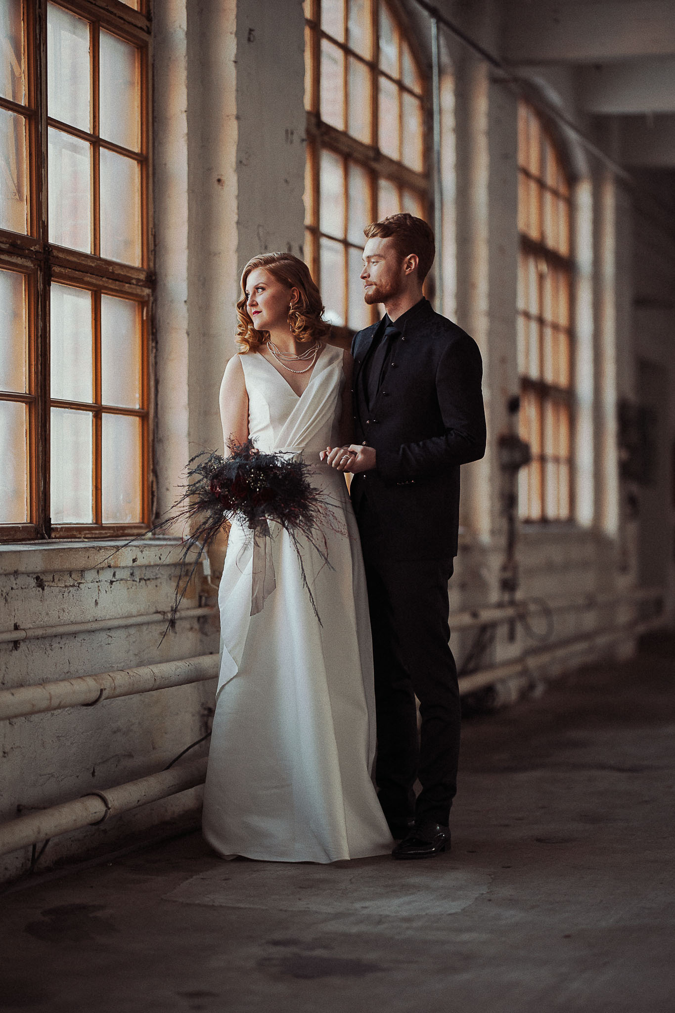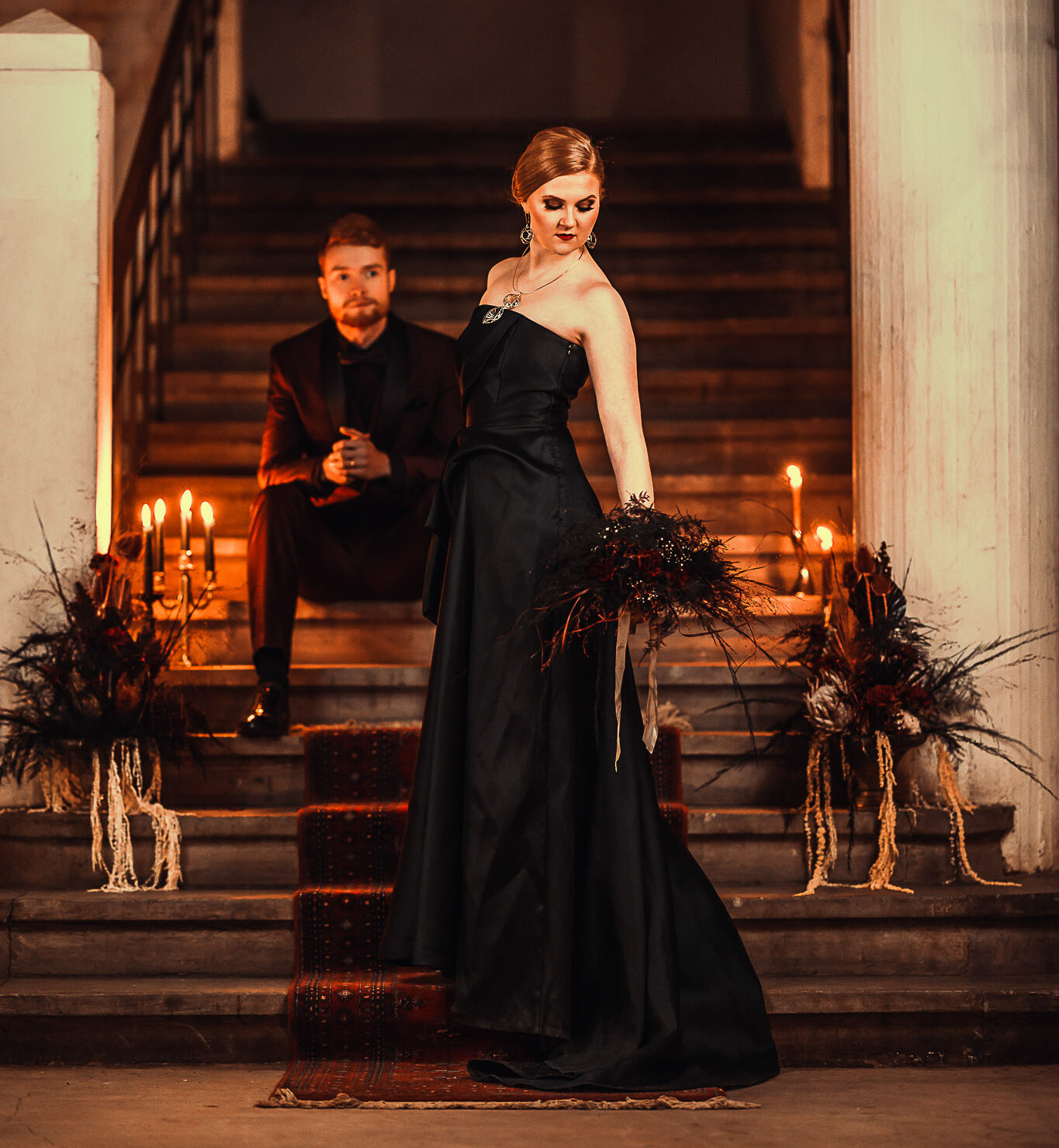 Tummaa tunnelmaa löytyy Hanna Korhosen 4C-korusarjasta koristepatinointina. Korusarja palkittiin Vuoden koru 2021 -kilpailun 3. sijalla. Morsiamen tumma iltapuku on Katri Niskasen ja sulhasen puku Kavaljeerista.