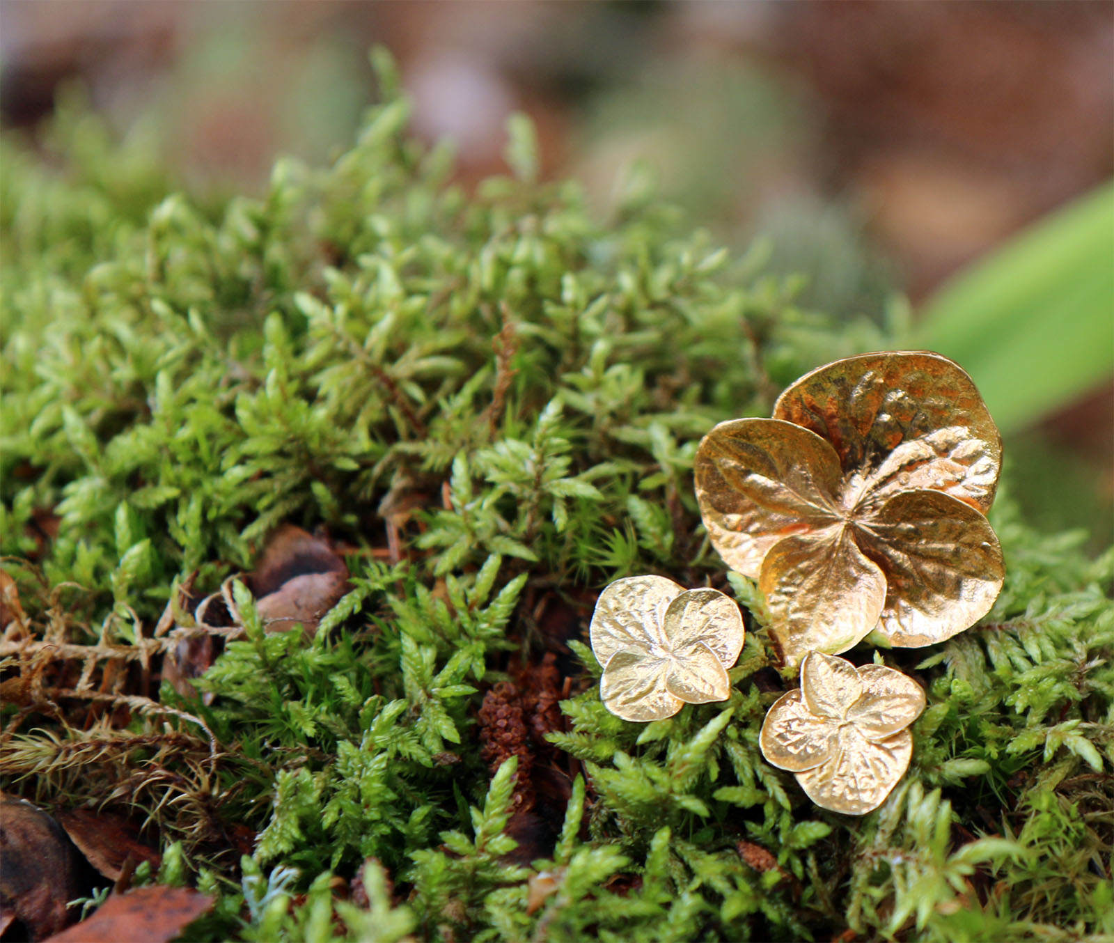 Sormuksessa jokainen oikean hortensiankukan yksityiskohta on tallennettu ikikukaksi, joka sopii modernillekin naiselle. Kullatussa sormuksessa on pinnassa ohut kerros puhdasta kultaa. Kullan hehku hortensiakoruissa on kauniin raikas ja moniulotteisella pinnalla valo ja varjo korostaa kukan tekstuuria. Kukka kiinnittyy pyöreärunkoiseen sormusosaan, nostaten kukkaa hentoisesti ilmaan sormien tasosta. Hydrangea-sormus on naisellinen ja romanttinen, mutta tyyliltään kuitenkin ajaton. Raikas lähestymiskulma kukkateemaan tekee hortensiakoruista rönsyilevien sijaan yksinkertaisen tyylikkäät. Hydrangeassa on omanlaisensa nuorekas ja moderni tuntu, joka sopii hyvin myös trendikkäälle naiselle.