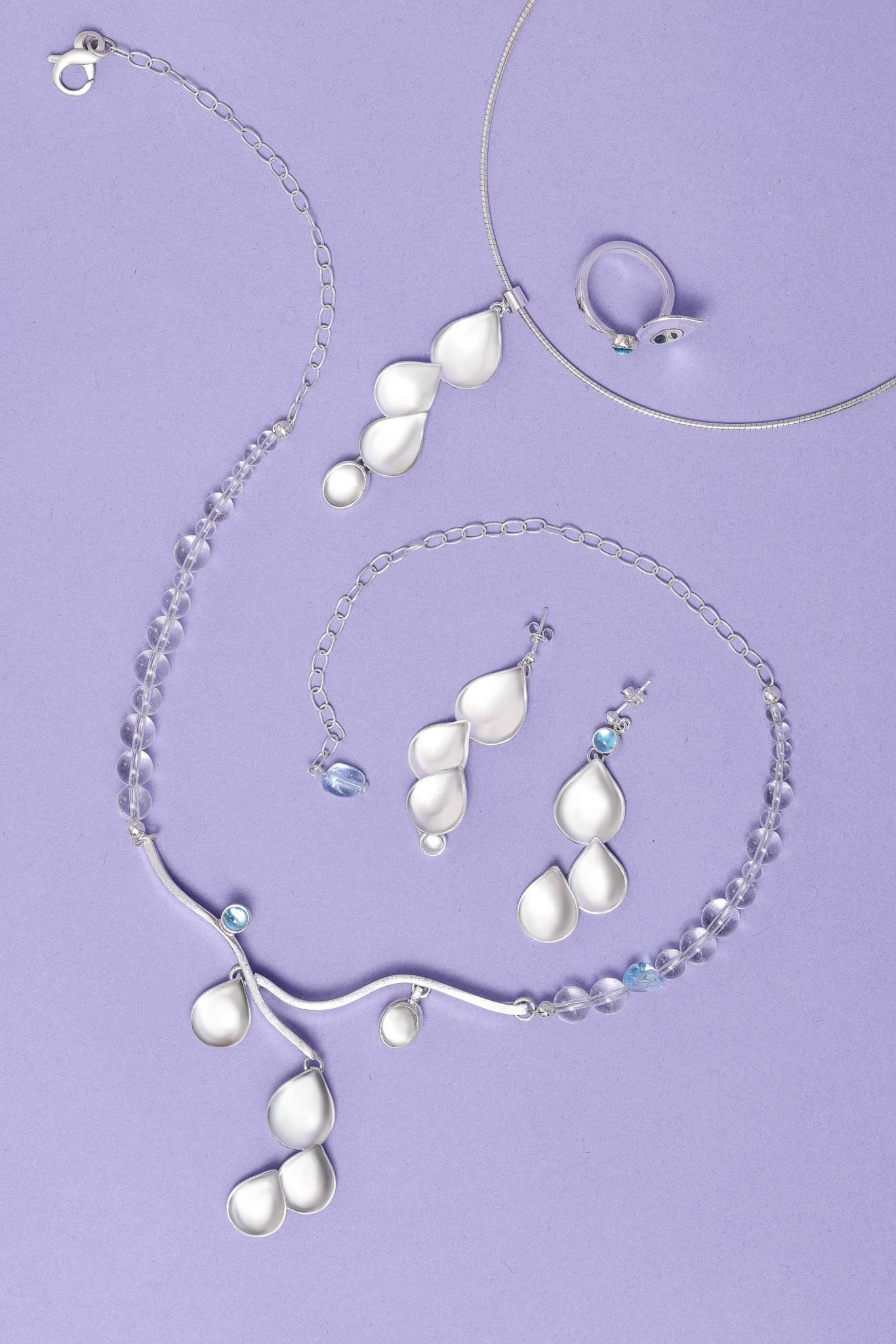 Kesäsade-korut vievät mukanaan kesäiseen sadekuuroon, jossa sadepisaroista huolimatta aurinko paistaa. Marin hopeasta käsityönä valmistetut pisarat heijastavat valoa peilipintaisina, luoden illuusion sateen liikkeestä ja kesäpäivän kirkastumisesta. Topaasin taivaansininen sävy ja kirkkaat vuorikiteet täydentävät korusarjan tunnelman. Korusarjaan kuuluu näyttävä kaulakoru, riipus, epäsymmetriset korvakorut sekä pisaran muotoa jatkava sormus.